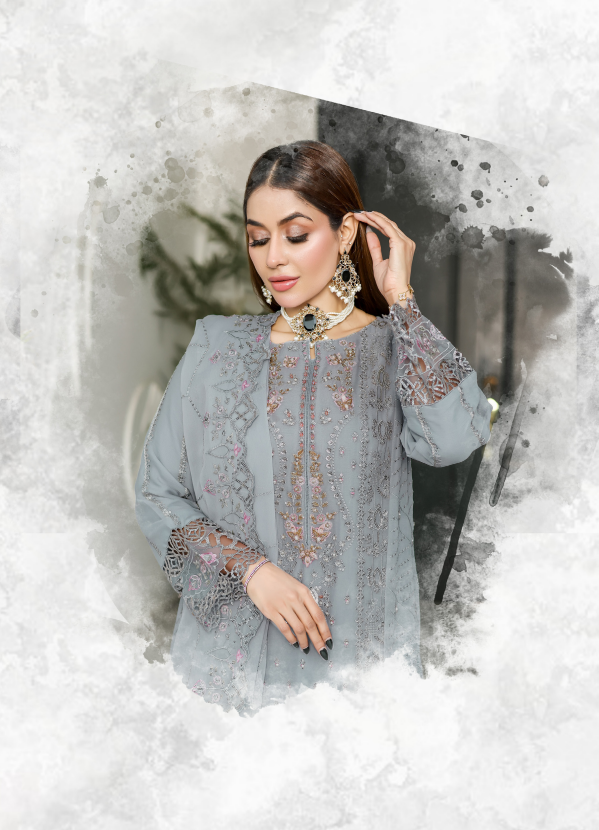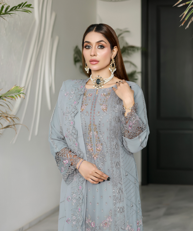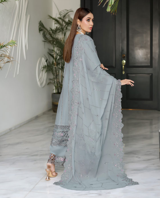 Coordinated straight pants echo the kameez’s embroidery, enhancing its refined silhouette and maintaining an effortless harmony. Completing the look, the embroidered georgette dupatta showcases fine scalloped borders and shimmering sequin highlights that move fluidly with every step.